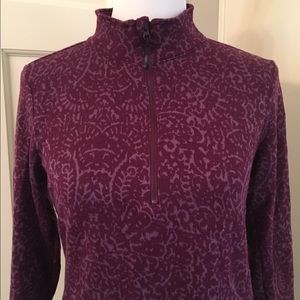 Purple/wine colored sweatshirt-type pullover with front zip. Ruching in back adds a touch to the styling. Like new! 60% cotton, 40% polyester; machine wash, tumble dry.