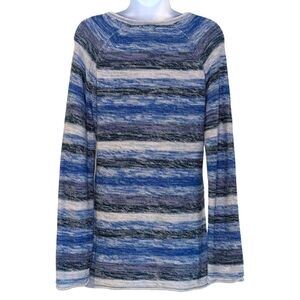 Super soft and cozy long sleeve sweater with gray, blue, purple and green tone stripes throughout.