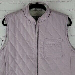Eddie Bauer Purple Quilt Pattern Vest With Zipper Closure. Has 3 Pockets. Fleece-lined. Besides light stain over right chest, vest is in excellent condition. May come out if treated.Not very noticeable. Size Extra Large.