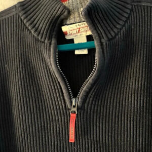 Eddie Bauer Quarter Zip Pullover Men’s Size XL Sweater Navy Blue “Sport Shop Seattle” Badge on Sleeve. Made in New Zealand. Gray interior with Red inside stripe. Zips to the neck. Pre-owned, Heavy Sweater.