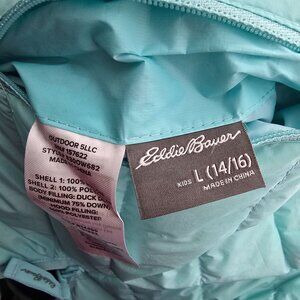 Eddie Bauer REVERSIBLE Soft Aqua Navy Down Winter Puffer Jacket Girls Size L 14/16