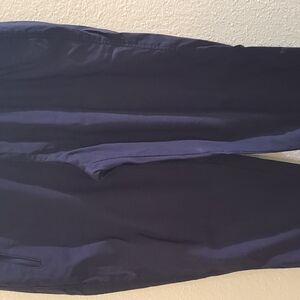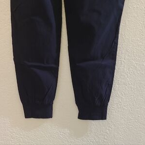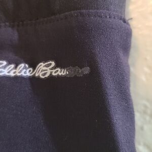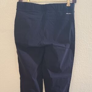 Stylish and versatile women's' black pants, perfect for any active sport or the right job. Elastic waist, Self fabric cuff at the bottom of each leg. Two front zip pockets. False fly. Yoke/Seam on back. From the crotch seam to bottom of cuff is 28". Eddie Bauer signature on back right side is missing the "er" in Bauer.