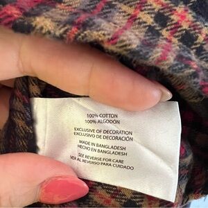 Stylish plaid shirt with red and gold hues. Perfect for casual outings. Comfortable fit.