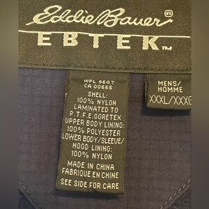 🧥 size XXXLarge. Stylish windbreaker by Eddie Bauer. Features a bold red and navy design. Lightweight and perfect for outdoor activities. Jacket has a front zipper closure with a snap flap and a removable hood. Coat has a vented design and is water resistant. There is a light weight inner lining that is warm and made of polyester. The Eddie Bauer iconic logos add a flair to retro piece. There are 4 outer zipper pockets and 1 inner zipper pocket. No stains or tears. Great preowned condition 🧥