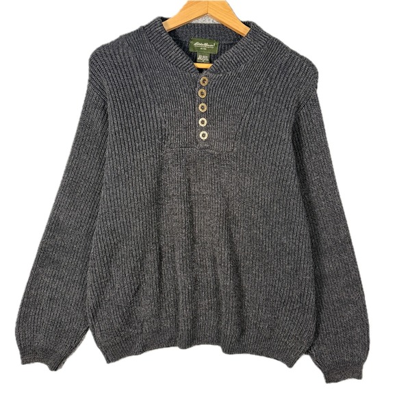 Keywords: Eddie Bauer sweater, charcoal knit, button neck, ribbed texture, mens pullover, cotton blend, outdoor apparel, casual wear, layering piece, fall fashion, winter essential, heritage style, comfortable, durable