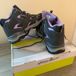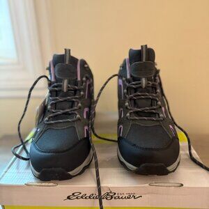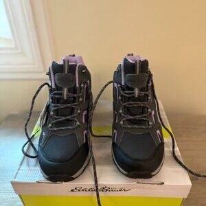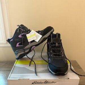 Brand new in box Eddie Bauer San Juan Men's hiking boot in size 9.5. Black and purple mesh and suede hiking shoe. Brand new men's shoe with box and tags.