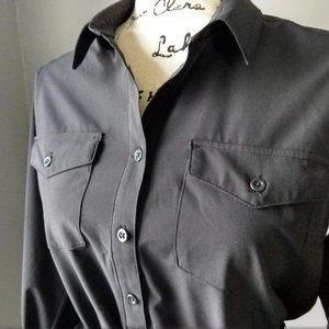 Lightweight and comfy shirt dress with chest pockets and tie belt (detached). Sleeves can be worn rolled or unrolled. "Athletic" type material is a polyester/spandex blend that moves well and has some stretch, but keeps its shape well. Wear on its own for summer, and with leggings and a sweater for winter! Very versatile and great for travel!