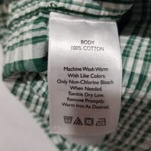 This is an Eddie Bauer men's shirt in size Large, featuring a classic fit with a green plaid pattern. It is a short sleeve button-up shirt made of lightweight cotton seersucker fabric. The shirt has a button-down collar and accents, with a chest size of 44 inches. Ideal for casual, workwear, or business occasions, the shirt also includes pockets and is machine washable. Perfect for summer and spring, its design is themed around a dad, outdoor, and classic style.