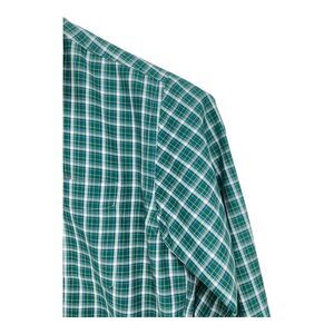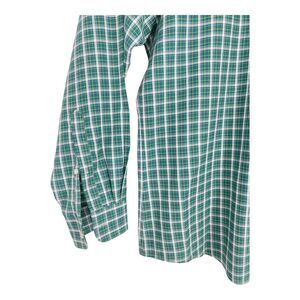 This Eddie Bauer button-front shirt is a perfect addition to any wardrobe. Made of comfortable cotton, the shirt features a classic fit with long sleeves and a collared neckline. The green plaid pattern adds a touch of style to the shirt, which is perfect for casual occasions. The shirt is pre-owned, but is still in great condition and has been well taken care of.