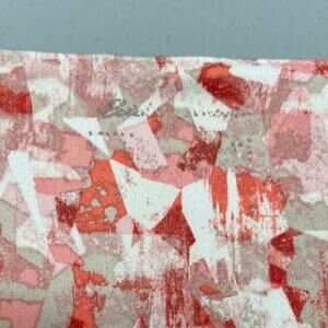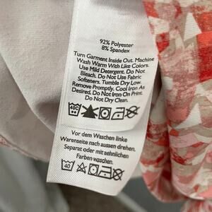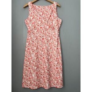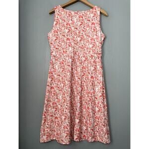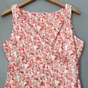 Eddie Bauer sleeveless faux wrap surplice top pinks, white, orange, red, and tan abstract print tee knit dress in Excellent pre-owned condition.