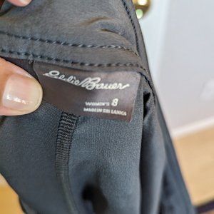 Eddie Bauer skOrt, steel gray, size 8, poly/elastane blend. Button zip closure, angled J pockets in front - lined in mesh - , belt loops, Back yoke and hidden, angled, back pockets.