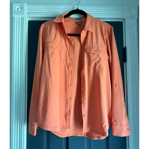 This is a pre-owned Eddie Bauer long-sleeved shirt. It is made of 86% polyester and 14% spandex. The shirt is a solid coral color and features a button-down front, two chest pockets with button closures, and roll-up sleeves with button tabs. The shirt is in good condition with no visible stains, tears, or other imperfections.