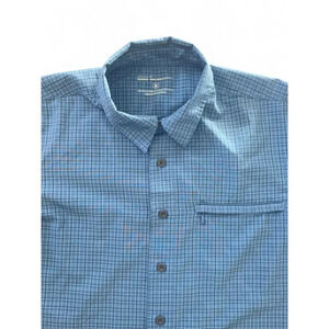 Eddie Bauer Sport men's button down polo is short sleeve and a blue plaid pattern. Button down has gray buttons, front zipper pocket, and vent holes for under arms.