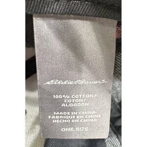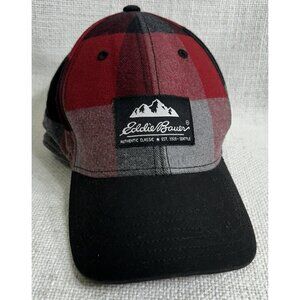 This Eddie Bauer baseball cap features a black and red plaid pattern, made of cotton flannel. It is one size with an adjustable strapback design. Suitable for outdoor activities like hiking, the cap is perfect for all seasons.