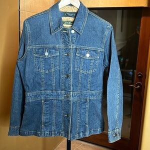 Classic Eddie Bauer stretch denim jacket in a medium/dark wash, size Medium (runs slightly large). Made from a soft and durable cotton-spandex blend with just the right amount of stretch for comfort and easy layering. Features a button-down front, two chest flap pockets with metal logo buttons, and a flattering stitched waist seam that gives it a structured, feminine silhouette.