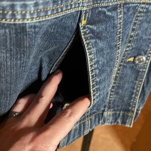 Eddie Bauer denim jacket, stretch denim jacket, women’s jean jacket, medium wash denim, classic denim coat, button down jean jacket, casual outerwear, everyday denim, outdoor jacket, medium size jacket, vintage style denim, Y2K denim jacket, Eddie Bauer outerwear.
