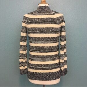 Cozy sweater by Eddie Bauer that can be worn closed as a sweater or open as a cardigan. Asymmetric Zipper and interior button closure. Colors are cream/navy/Gray/light blue. Very pretty piece!!! Excellent condition! All measurements are approximate, taken flat and zipped closed.