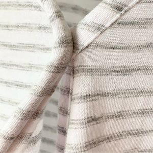 Elevate your style with this chic striped V-neck wrap top. Perfect for any occasion, this top offers a flattering fit and timeless design. The gray and white stripes add a touch of elegance to your wardrobe.