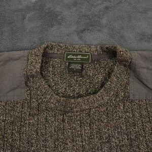 Keywords: Eddie Bauer, mens sweater, crew neck, pullover, elbow patches, outdoor, casual, textured knit, layering, fall fashion, winter wear, classic style, heritage brand