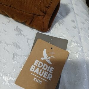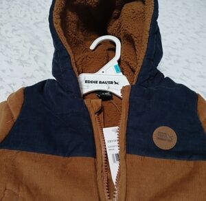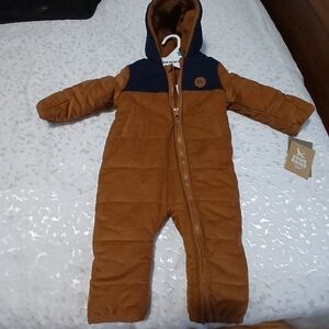 Warm and stylish one piece for kids. Features a cozy hood and easy zip closure. Brand new Eddie Bauer size 3/6 mts.