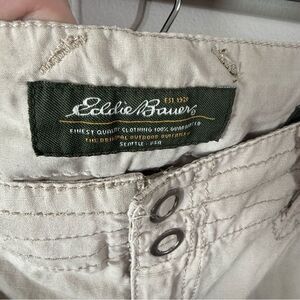 Experience comfort and style with these Eddie Bauer tan cargo pants, crafted from a lightweight cotton blend for a relaxed fit. Ideal for casual outings, these pants offer a versatile look with their classic cargo design.