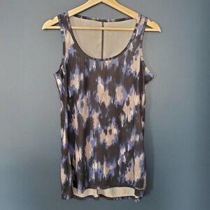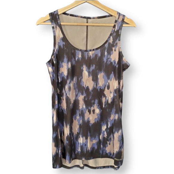 Eddie Bauer tank top with blue and cream abstract design. Soft, silky, and stretchy material. Slightly longer in the back