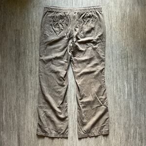 Taupe linen and cotton blend flowy pants with a drawstring waistband and functional pockets on the front and back. Super lightweight and breathable. Excellent condition!