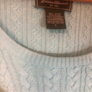 Beautiful teal Eddie Bauer cable knit sweater with round neckline. Cotton and cashmere blend, in excellent condition with no defects noted.