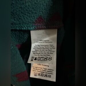 Cozy teal fleece with vibrant pink patterns. 1/2 zip closure. High collar for warmth.