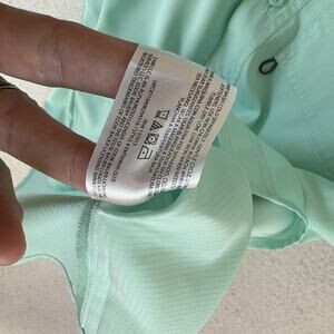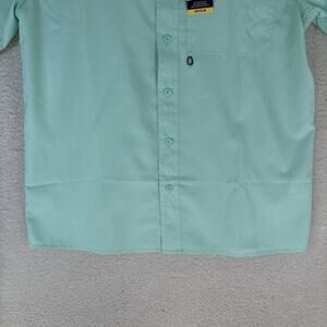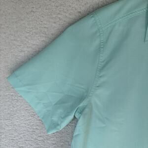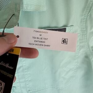 The Eddie Bauer Tech Woven Shirt for men in size Medium is a stylish and practical addition to any outdoor enthusiast's wardrobe. Made of lightweight and breathable polyester, this teal blue short sleeve shirt features a solid pattern with a collared neckline and button closure. Ideal for fishing, hiking, and other outdoor activities, this shirt is designed for comfort and ease of movement. With vented and breathable features, it is perfect for warmer weather in the summer, fall, and spring seasons. Additionally, its durable fabric makes it easy to care for with machine washable instructions.