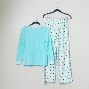 One of the pajama pants are a light green color featuring blue, purple, and teal Polka dots. The second pajama pants is aqua blue color with green leaves and pink flowers, foxes, and deer printed throughout. Both pajama pants feature stretchy waistbands with a faux drawstring bow on the front.