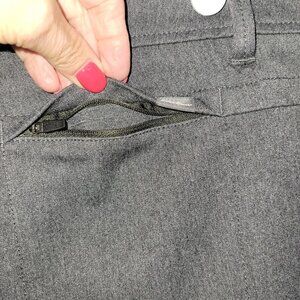 -Features - Zip/button closure, 2 front slash pockets, 1 front secure zipper pocket, 1 back pocket, some stretch, flat front
