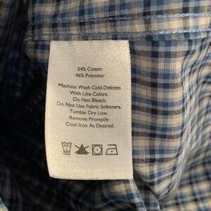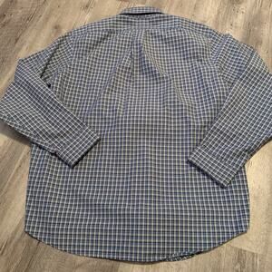 The Eddie Bauer Travex Shirt is a classic men's button-up shirt in size large with a relaxed fit. Made from a comfortable cotton blend fabric, this shirt features a blue plaid pattern and long sleeves, making it suitable for travel and casual occasions. With a collared neckline and button-down collar style, this shirt also includes lightweight and breathable features, as well as pockets for added convenience. Perfect for those who appreciate outdoor and fish-themed fashion, this Eddie Bauer shirt is machine washable and accented with the brand's logo. Armpit to armpit is 25 inches. Length is 32 inches.