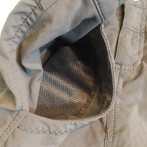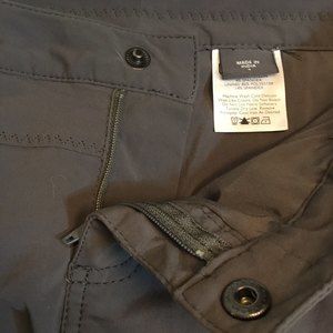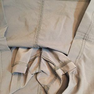 Great for sports and hiking. Smoke and pet free home. Gray with two front pockets and two back pockets with zippers. All zippers checked for function. Excellent pre owned condition.Nylon, spandex and polyester. Short length.
