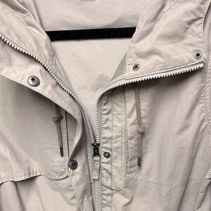 Women's Eddie Bauer Trekker Trench in color Stone (a light khaki color - see actual images, not just main stock photo). Made with durable material and treated with a storm repellant and DWR, this is a great jacket for rain or other touch outdoor elements. Features large pockets to fit many items. Excellent condition, worn once and no notable flaws. Currently retails for $149, and is a sold out color.