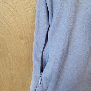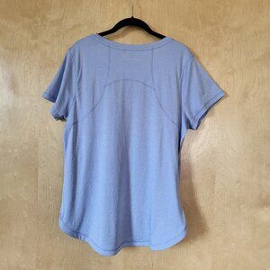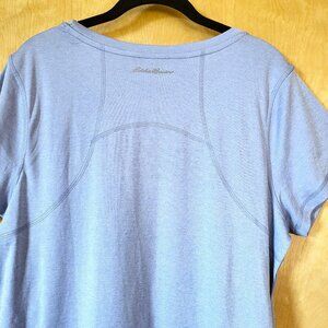 Eddie Bauer River tee with zippered side pocket. Multifunctional fabric with sweat wicking tech and protestive UPF 50 finish. Color is “Blue Heron” a cool light blue.