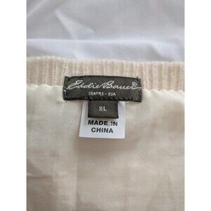 The Eddie Bauer VTG Sweater is a luxurious and stylish women's XL cream cardigan made with a blend of lamb's wool and nylon, with a silk and cotton lining. This vintage piece features a tight-knit design with pearl and sequin accents in gold and silver, adding a touch of elegance to the classic round neck and long sleeves. The sweater is lined for added comfort and is recommended to be dry cleaned only to maintain its quality. Perfect for those who appreciate designer, holiday, 80s, and 90s-themed sweaters with a Belle-like character.