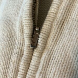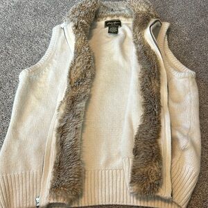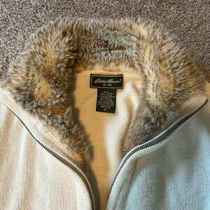 Eddie Bauer brand white/cream color sweater vest with angora on the collar and following the zipper. Perfect piece to layer for fall/winter weather. Size is petite medium.