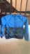Bright blue jacket with playful patterns. Hooded design. Perfect for kids.