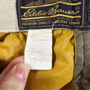 Vintage 1970's men's size medium Eddie Bauer brown quilted duck down banded ankle snow pants. Ultra warm interior, some minor flaws-pictured. Please review all photos for any signs of wear-pictured as is. Disclaimer: Any items with any wear/staining has not been treated, and unsure of ability to remove/treat condition. Comes from a smoke free home, bundle with other items to save & minimize shipping cost.
