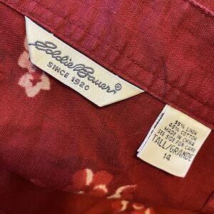The Eddie Bauer Vintage Linen Cotton FullWrap Maxi Skirt in size 14 features a vibrant red floral pattern, perfect for a hippie or bohemian-inspired look. This lightweight and machine washable skirt is made from a blend of linen and cotton, making it ideal for all seasons, especially summer, fall, and spring. The skirt is designed with a button closure, mid-rise fit, and a long length, offering a comfortable and stylish option for casual, workwear, or travel occasions. With its vintage appeal and 90s beach theme, this skirt is a versatile addition to any woman's wardrobe.