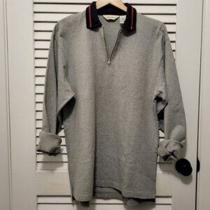 Excellent condition. no flaws. 1990s vintage Eddie Bauer Men's Medium (runs big IMO, see measurements) 1/4 zip pullover in Heather Gray w/a Navy Blue + Red collar, 100% Cotton (heavyweight). Smoke-free home.
