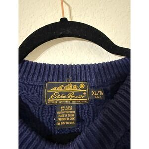 Keywords: Eddie Bauer sweater, mens knitwear, navy sweater, cable knit, crew neck, long sleeve, cotton sweater, fall fashion, winter essential, casual wear, outdoor outfitters, preppy, classic style