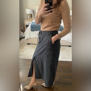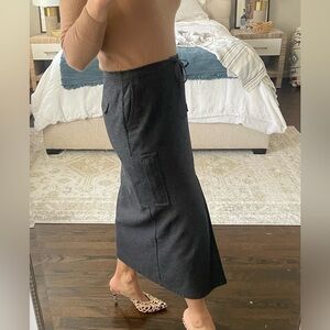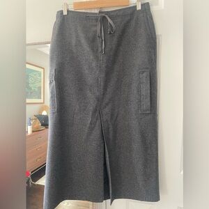 Gray wool blend midi skirt from Eddie Bauer. Vintage, made in Hong Kong. Cargo pockets at sides. Front zip and button as well as drawstring closure. Lined. Excellent condition. Size 10 Petite.