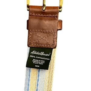 Eddie Bauer Vintage Pastel Spring Yellow Stripe Tan Leather Belt Men 31"-35"