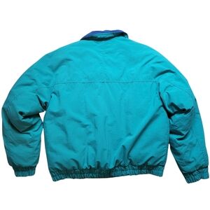 This teal and blue nylon vintage puffer jacket by Eddie Bauer is in excellent pre-owned condition with no discernable rips or stains! It is a full-zip with button closures and multiple zip pockets. One of the front pockets is missing the blue pull tab. It is premium goose down fill. Please see tags for close-ups and tag information!