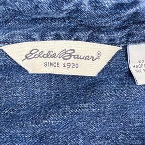 Vintage Eddie Bauer denim blouse in a sleeveless design, perfect for casual or summer wear. Features a button-down front and a classic collared neckline, offering a timeless and versatile look.