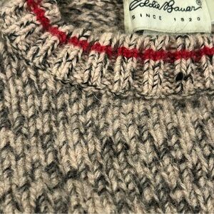 Excellent condition Eddie Bauer Marled Wool Crewneck Sweater with Red Trim. Nice tight knit. Great tan/black/red color scheme.