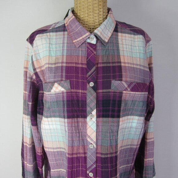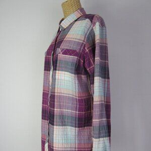 Eddie Bauer Women L Purple Plaid Live Your Adventure LS Shirt Crinkle Cotton
