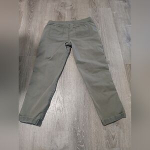 Item: Pull on green pants. cuffed bottom pant legs. Has 2 front functioning pockets and 2 faux back pockets. Easy to pull on and off. Casual everyday pants.